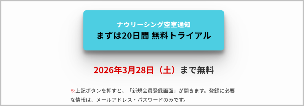 新規会員登録を行うと、ナウ・リーシングの「空き室探知・通知システム」の無料トライアル20日間を即座に利用できます。登録・利用に必要な情報は、「メールアドレス・パスワード・Line」のみです。無料トライアルのご利用には、カード情報登録不要、有料プランへの自動更新もありません。退会もいつでもできます。手順は、以下の通りです。
