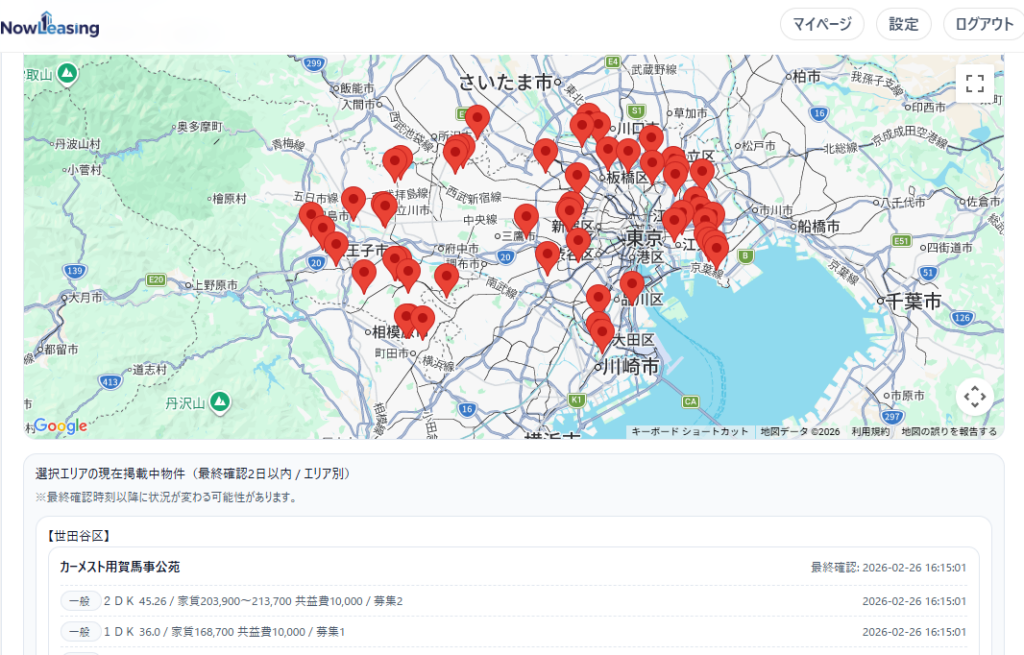 NowLeasingは、「JKK東京の一般賃貸住宅物件」を中心に、不動産空室物件を探知したら即座にお客様に通知するサービスを提供しています。ナウ・リーシングに会員登録をすると、無料トライアル20日間の後も、月額システム利用料のお支払で、サービスが継続利用できます。どのような会員サイトなのかをご紹介します。クリックすると画像が拡大します。