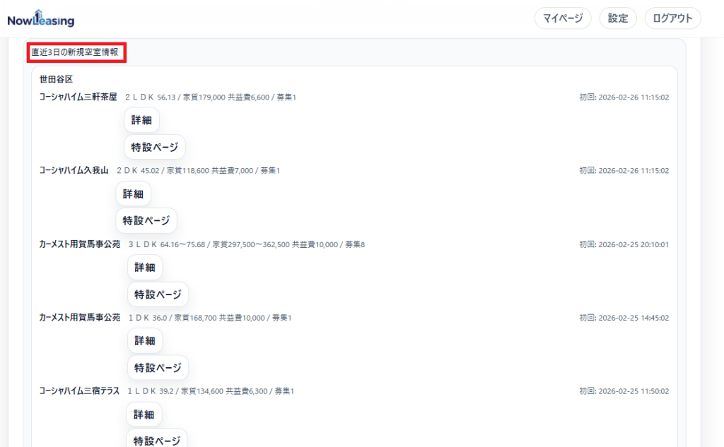 サイトでは最新の空室情報を閲覧することができます。