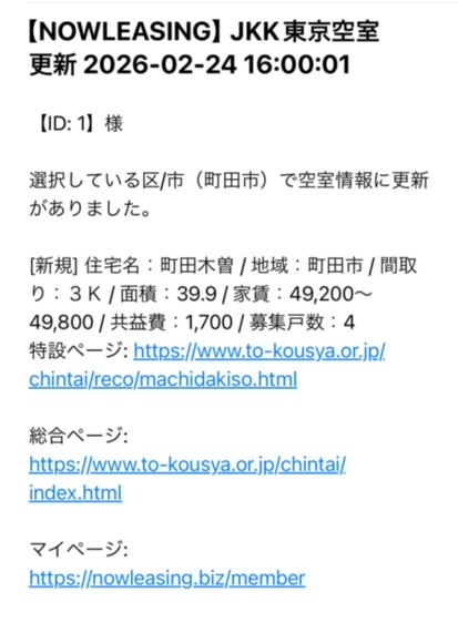 JKK東京の空き室情報を常時監視します。希望エリア・物件名など、保存した登録条件に該当する物件に空き情報がないか自動チェックします。JKK東京の「一般賃貸住宅」が対象です。